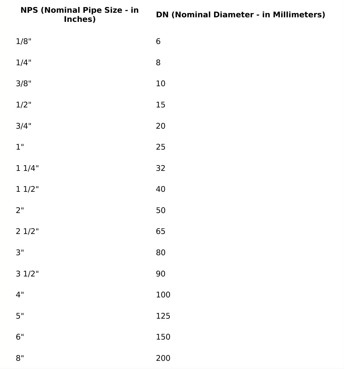 Cu toate acestea, există și excepții. De exemplu, 3" × 25 = 75, care se rotunjește la DN80. Există, de asemenea, dimensiuni în inci cu fracții sau zecimale precum 1/2", 3/4", 1-1/4", 1-1/2", 2-1/2", 3-1/2", acestea nu pot fi calculate în acest fel, dar calculele sunt aproximativ aceleași, sunt în mare parte valori standard :