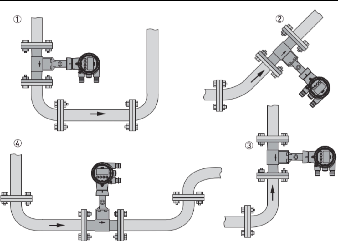 Pentru aplicații cu gaz/abur, conducta este întotdeauna plină cu gaz. Prin urmare, debitmetrul poate fi instalat în debit vertical în sus, debit vertical în jos sau orientări orizontale. Cu toate acestea, nu trebuie instalat în puncte joase. Pozițiile de instalare recomandate sunt: