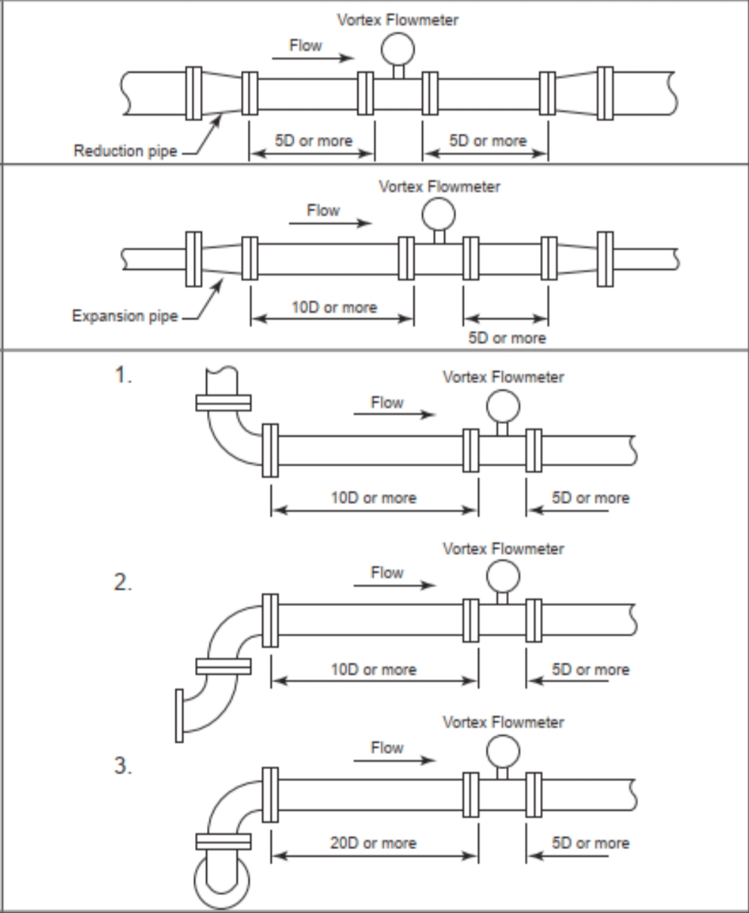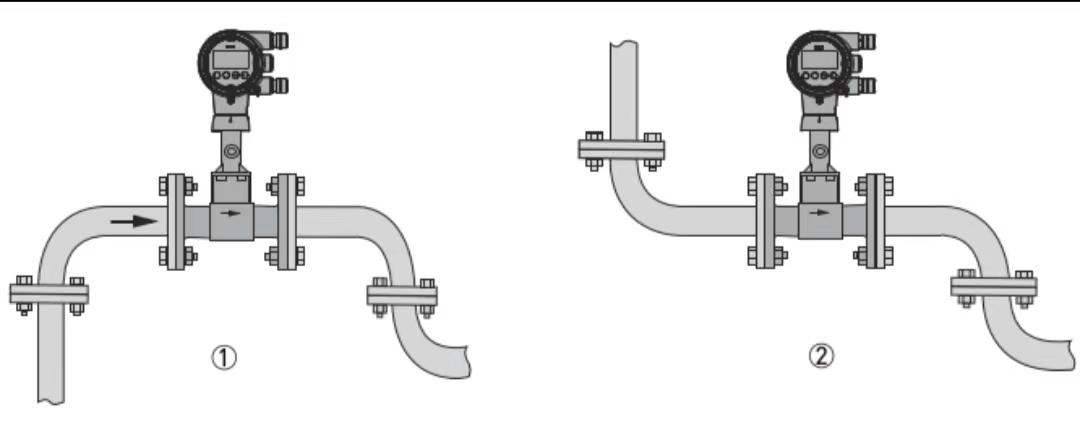 3.Secțiuni de conducte drepte în amonte și în aval (dacă sunt necesare instrumente de temperatură și presiune, acestea trebuie instalate în aval de debitmetru. Instrumentele din aval trebuie amplasate și în afara secțiunii de conductă dreaptă. Ordinea de aranjare recomandată pentru mai multe instrumente este: debitmetru, transmițător de presiune, transmițător de temperatură). În general, consultați cerințele privind lungimea țevii drepte specificate în eșantionul de produs al producătorului (sau ghidul comun de 15D în amonte și 5D în aval conform manualelor instrumentului). Informați în prealabil echipa de inginerie a conductelor despre cerințele de conductă dreaptă din amonte și aval pentru debitmetrul vortex. Odată selectat producătorul instrumentului, cerințele de instalare trebuie reconfirmate conform specificațiilor producătorului.