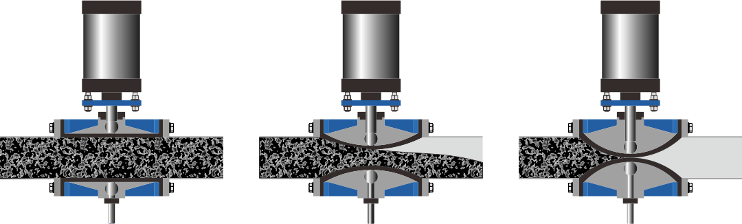 Închidere: Mecanismul de antrenare (manual, pneumatic sau electric) împinge două tije de prindere, comprimând cu precizie manșonul elastic de-a lungul liniei centrale pentru a obține o etanșare etanșă. Chiar și atunci când particulele solide sunt prezente în mediu, acestea sunt strâns închise și blocate.